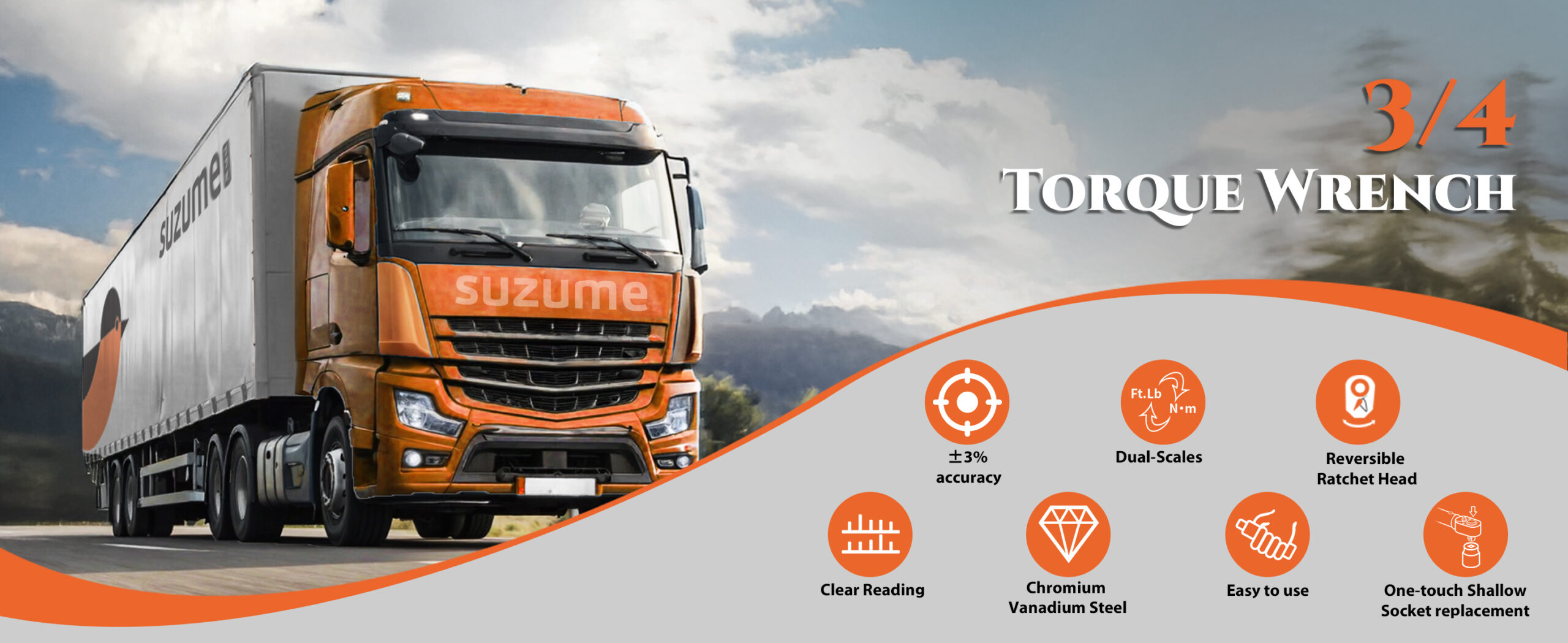 [Durable Material] This SUZUME 3/4 torque wrench features a chrome vanadium steel (CR-V) body—designed for long-term use, with resistance to oil and grime. The aluminum alloy handle features a comfortable, ergonomic anti-slip grip that helps reduce hand fatigue during extended use, while ensuring a steady, consistent hold. Whether you’re tightening semi-truck tire nuts or adjusting passenger bus parts, The torque wrench lets you get the job done smoothly and without hassle